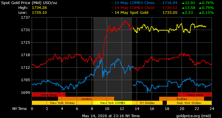 Trên thị trường vàng thế giới, giá vàng giao ngay chốt phiên đêm qua tại Mỹ tăng 15,1 USD lên 1.730,7 USD/ounce. Sang phiên châu Á sáng nay, giá vàng tăng nhẹ lên 1.731 USD/ounce. Giá vàng tương lai giao tháng 6 trên sàn Comex New York tăng 1,4 USD lên 1.742,3 USD/ounce.